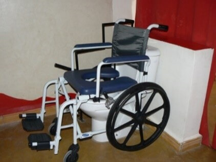 Wc suspendu avec chaise garde-robe (chaise percée), MAIS dépendance d’une tierce personne pour se déplacer