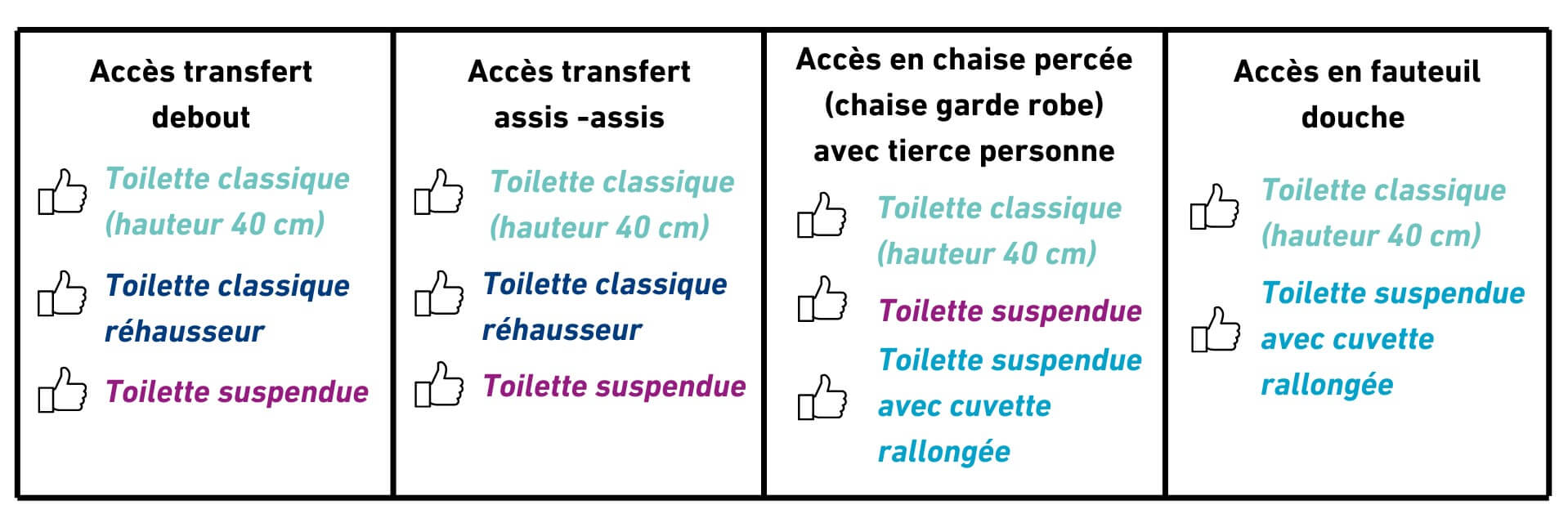En conclusion, le choix du modèle de vos toilettes (classique, suspendu, surélévée…) dépend de votre mode d’accès aux toilettes, via un transfert assis-assis, un transfert depuis la position debout ou via une chaise percée ou un fauteuil roulant douche.